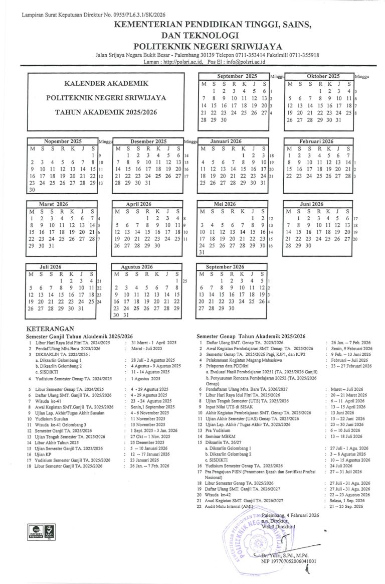 Kalender akademik Jurusan Teknik Sipil Politeknik Negeri Sriwijaya disusun sebagai pedoman utama dalam pelaksanaan kegiatan belajar mengajar. Setiap semester dirancang untuk memberikan keseimbangan antara teori dan praktik, sehingga mahasiswa tidak hanya memahami konsep dasar teknik sipil, tetapi juga mampu mengaplikasikannya dalam dunia nyata.